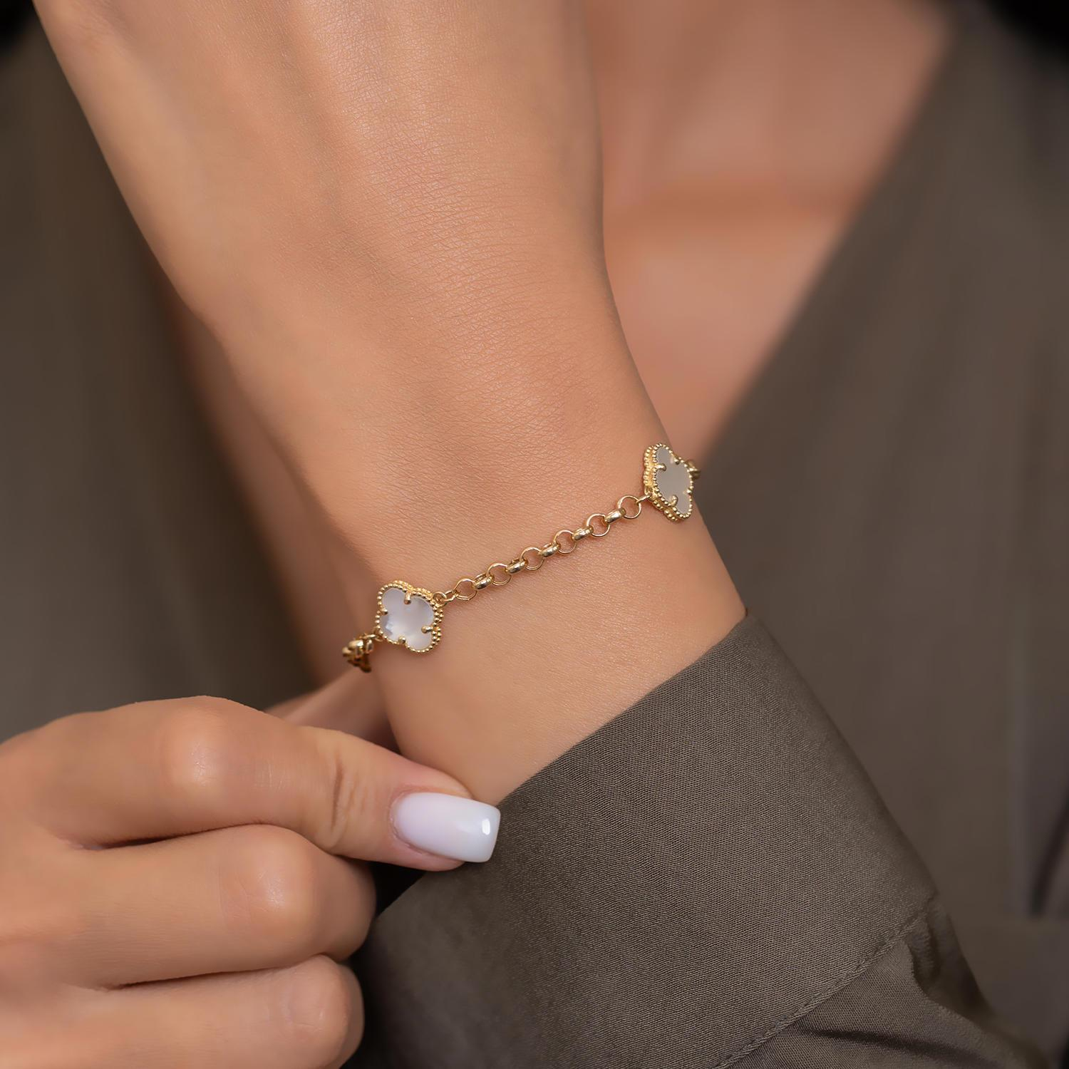 14 Ayar Altın Beyaz Yonca Bileklik